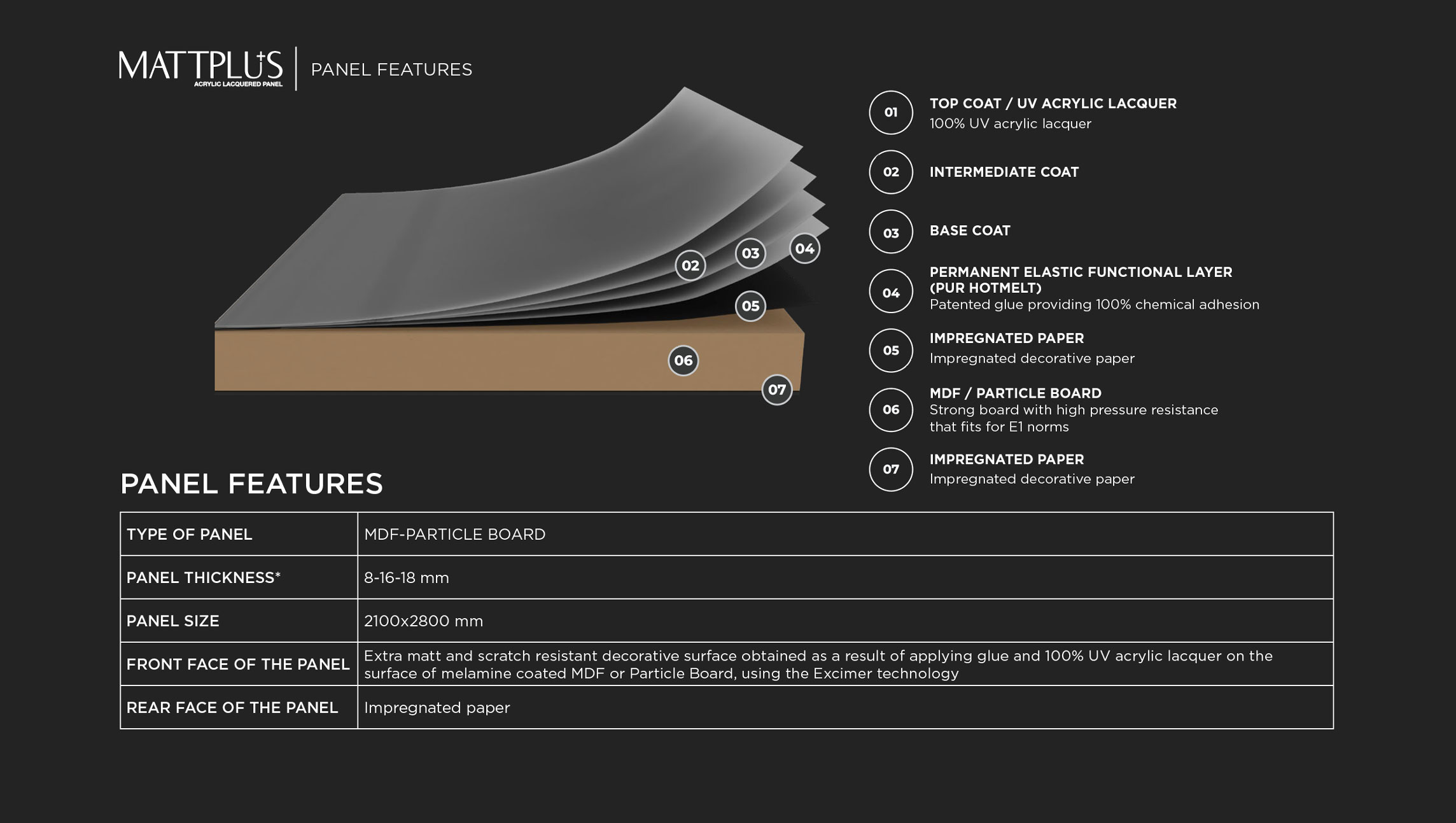 MATTPLUS extra matt panels are wooden panels with decorative extra matt surface which is obtained by application of glue and 100% UV acrylic lacquer on the surface of melamine coated MDF or Particle Board with an advanced and unique technology. High quality surfaces obtained by providing excellent distribution of light reflected by Excimer technology, brings out the perfect mattness with its natural appearance. In addition to the soft touch feeling, the products with high fingerprint resistance and easy to clean feature reveal the nobility of mattness in wood. The surfaces obtained during this process, which is based upon the principle of extra mattness and quality, are unrivaled in terms of applied